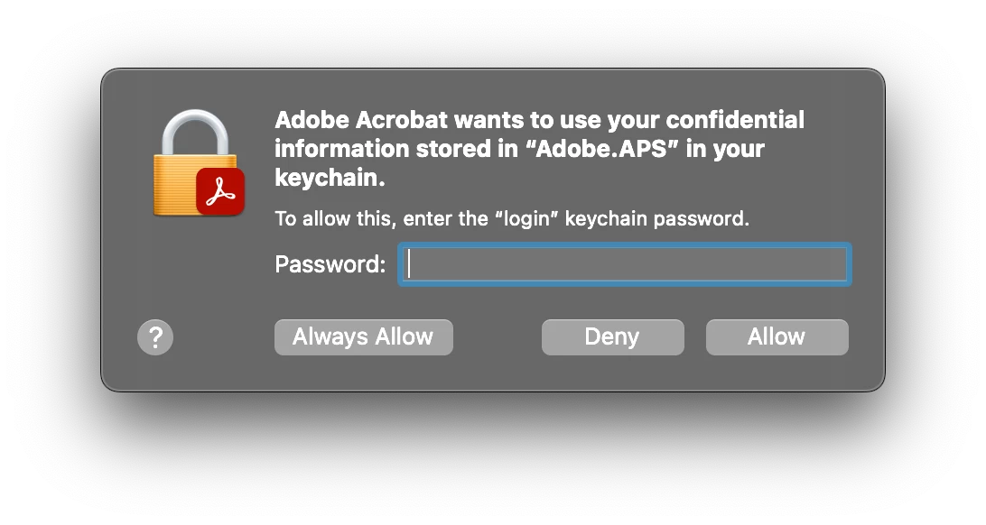 I run Mac OS Monterey 12.7.5 and am encoutnering a problem when I select 'Fill in form fields' on an open PDF. The following message is displayed: 'Adobe Acrobat wants to use your confidential information stored in "ADOBE.APS" in your keychain. To allow this, enter the "login" keychain password' I have never had the message before. I have tried selecting the keychain and used the associated password, but it doesn't work. I have the option to 'Always Allow'; 'Deny'; or 'Allow'. The application stops responding and I have to select 'Force Quit' to close it.