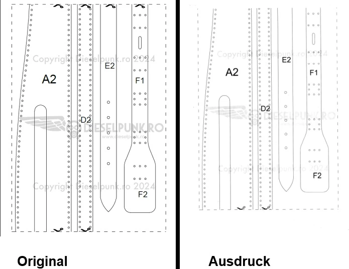Beim Gedruckten wurde der untere Rand verschoben und es fehlt oben die Schnittkante. Das Dokument muss mit der Option "Tatsächliche Größe" gedruckt werden, weil sonst die Maße nicht mehr stimmen.