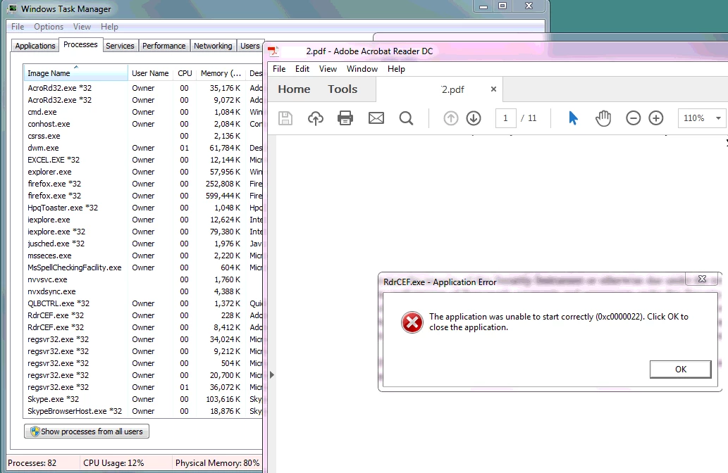 • Check if Rdrcef.exe is crashing [Go to task manager -> observe PID of RdrCEF processes, it changes]