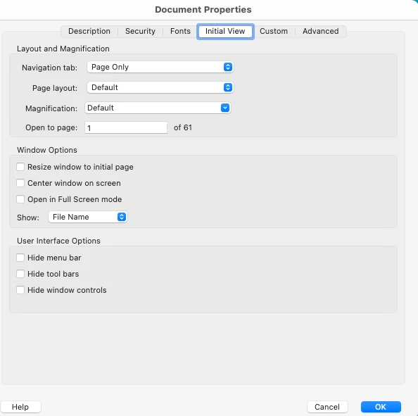 The initial view tab appears in Adobe Acrobat. It is not available in the Adobe Acrobat Reader version. The initial view properties override the application settings.