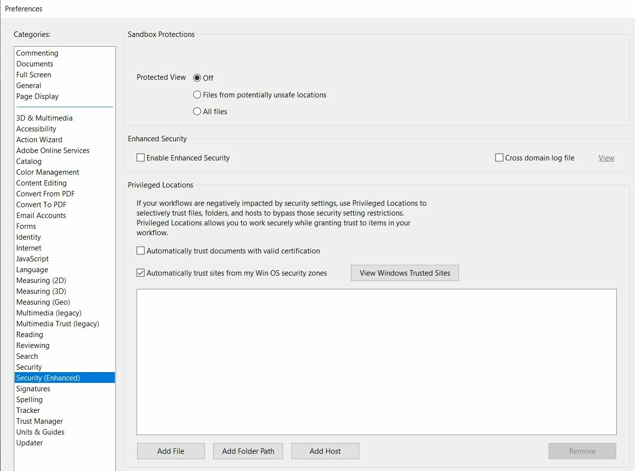 • Go to Edit-> Preferences -> Security (Enhanced) and check if "Run in AppContainer" is enabled or disabled?