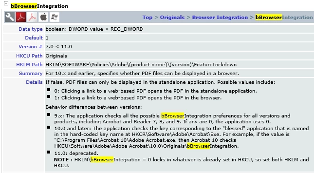 I was trying to change bBrowserIntegration registry key for these use to override but doesn't seem to work. I noticed one of the Adobe guides states that this key is deprecated in version 11