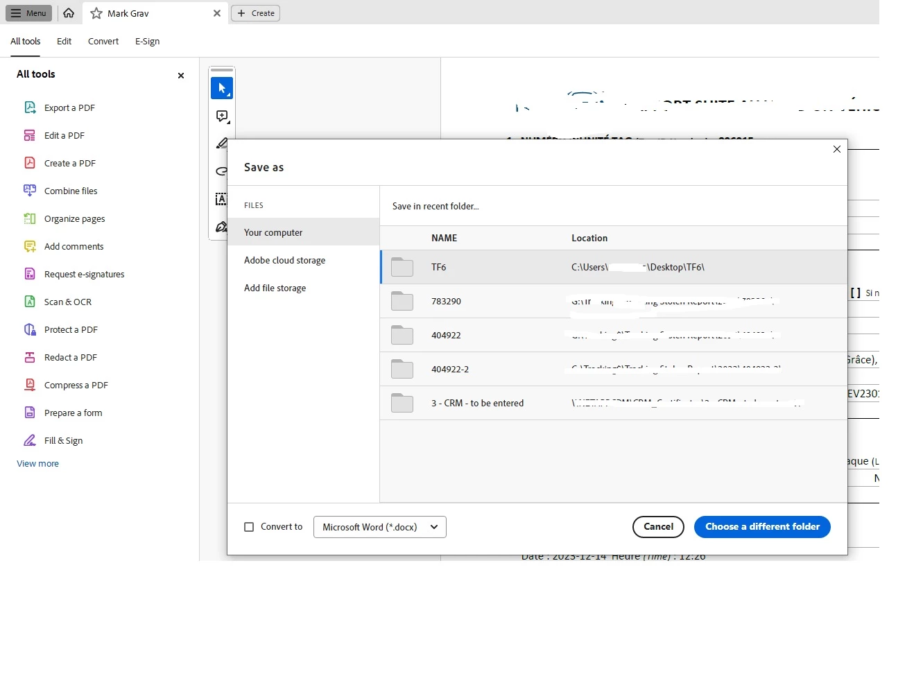 I'm using Acrobat Reader v. 2023.008.20421 on a Win10Pro machine, when choosing Menu, Save As.. it's showing me the recent files on my computers but when I choose the location I want, nothings happening unless I click on Choose a different folder.