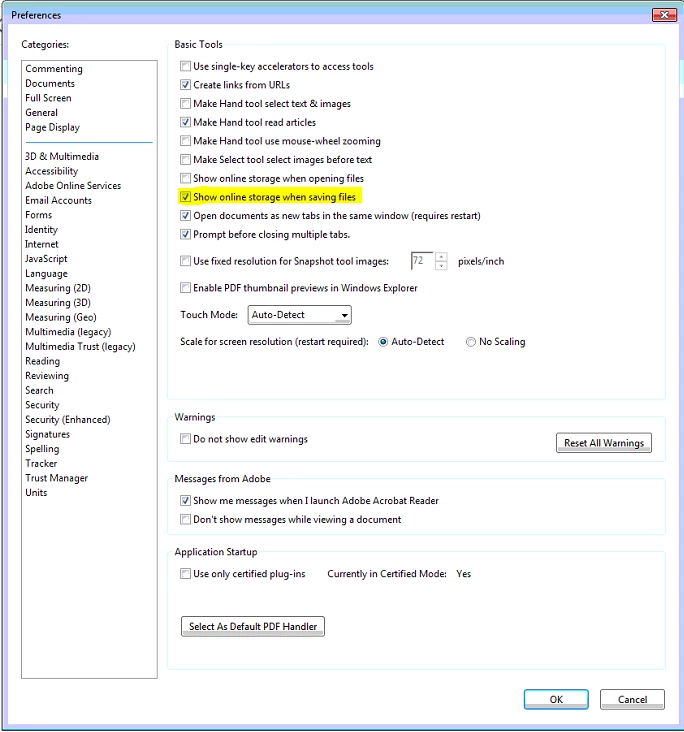 " Edit > Preferences > General > Un-tick 'Show Online Storage when saving Files'"