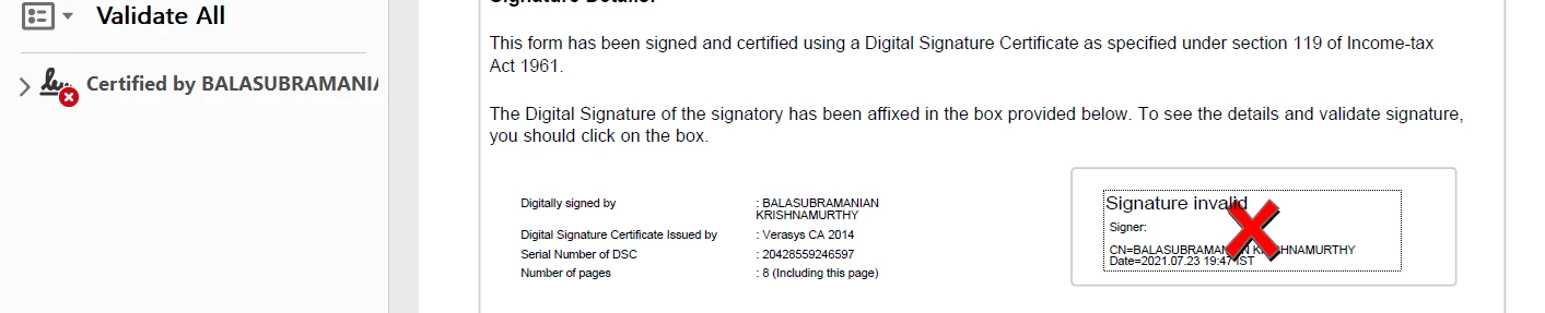 Hope you are doing well and sorry for the trouble.  As described the signature in the PDF is showing invalid.