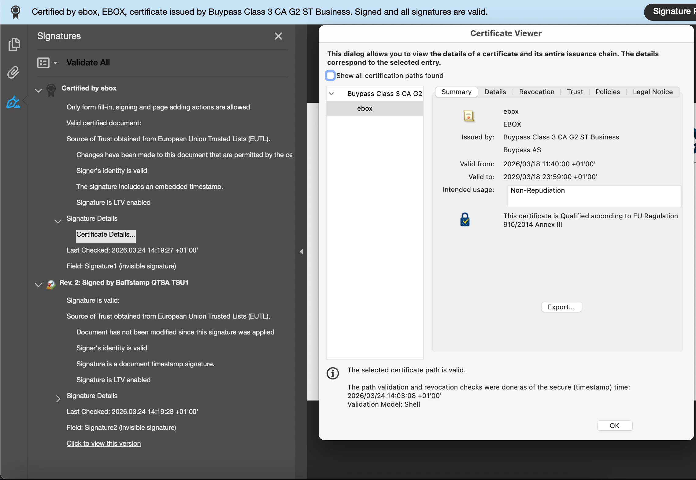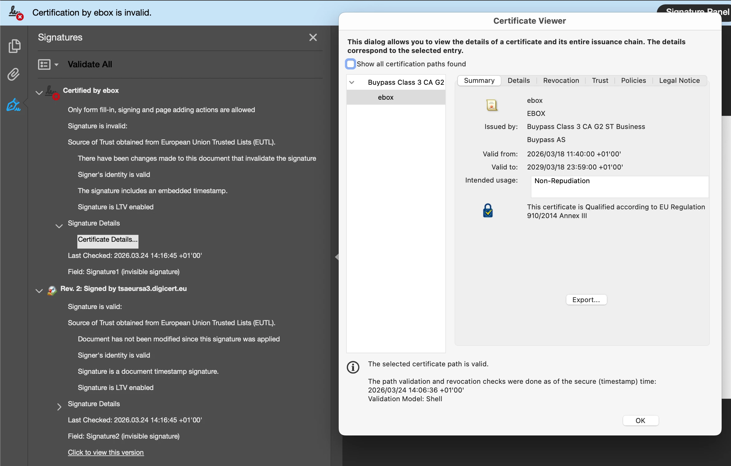 We have 2 files signed with EUTL trusted CA and LTA enabled with EUTL TSA (Timestamp).