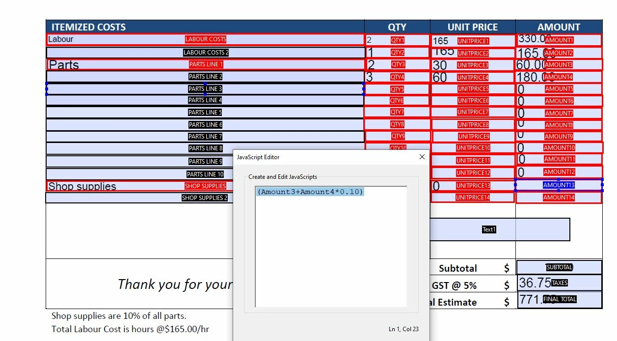 I can't get this formula to work on the repair invoice I am creating for my office. Can someone please assist? I have all the other fields working, I just need to be able to calculate the 'shop supplies' line at 10% of whatever a technician may put in the parts lines. Currently the parts are using the basic Adorbe formulas qty x unit price.
