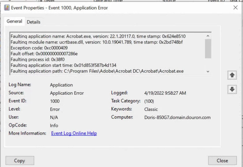 We are hoping that you are able to assist with an issue our client is experiencing with the latest Adobe Reader update. Whenever a user attempts to open a "fillable" pdf, Adobe Reader immediately crashes. This is happening on multiple machines with the same file. Please note the error below. Please also note that we have run an SFC, repaired Visual C++ where possible, and reinstalled Adobe. Please let us know of anything else we may attempt to correct the issue. Thank you.