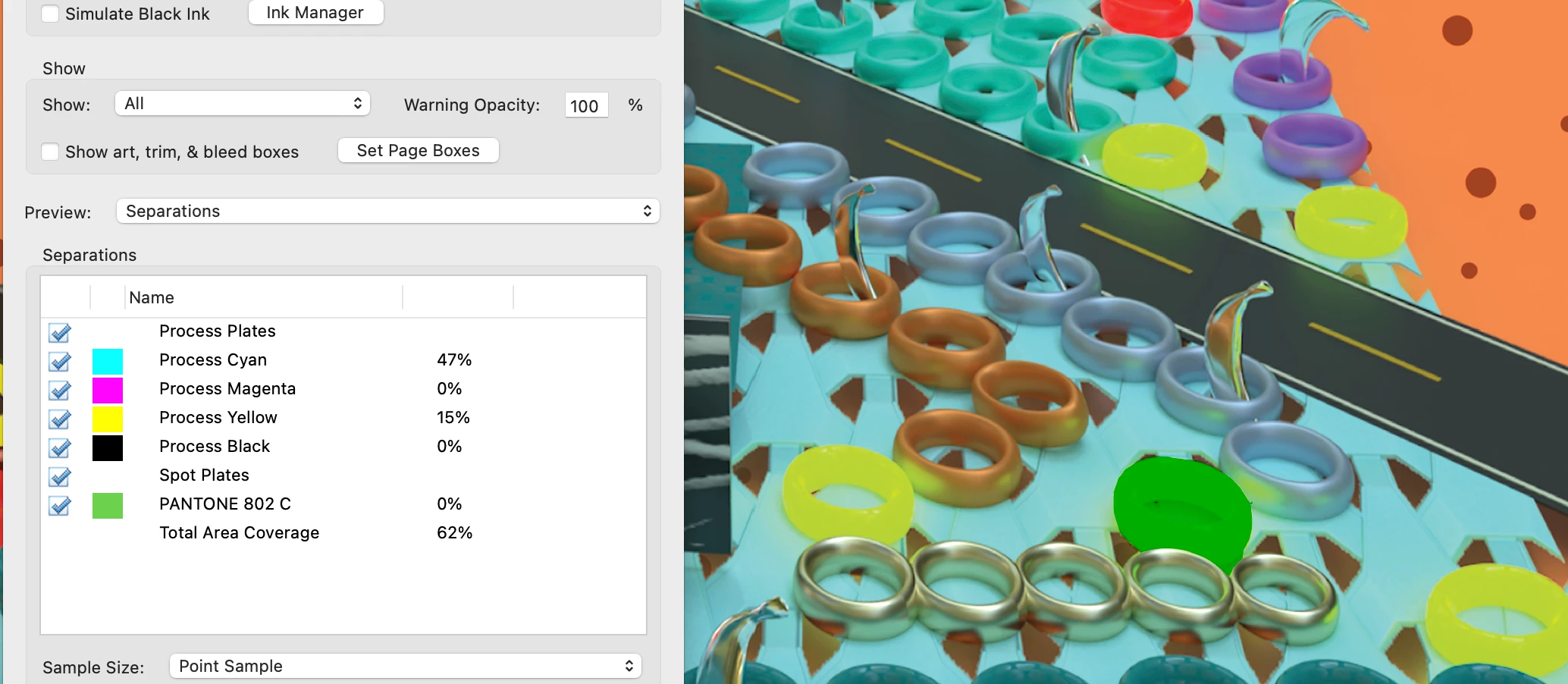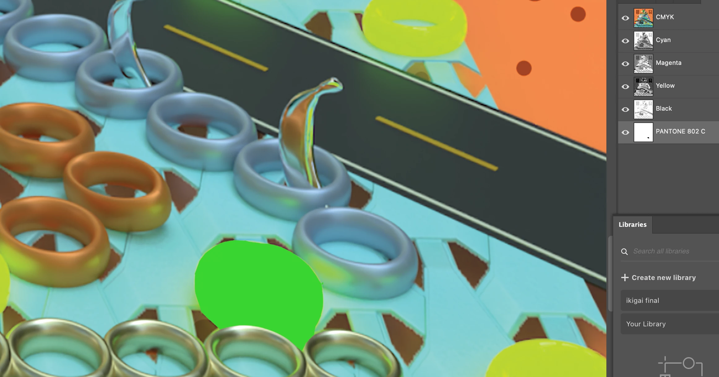 I have 3d artwork created in Adobe dimension of a kid's boardgame so lots of bright colors especially with 5 green fluorescent green ring objects. These objects are the only ones that's colour does not translate from RGB to CMYK. So I decided to add an extra spot color channel for those objects for printing manufacturer who have the Pantone 802 C I have chosen. The problem is many fold but the end result is simple, I cannot preview the color as intended in Acrobat to feel confident to send to manufacturer for mass printing. The weird thing is I was seeing the fluoro green adhering to the K channel black objects before I worked out how to create a new channel and I knew the spot was attracted to BLACK first and foremost but now that I have defined my own black areas in pantone channel I am just getting a dark green. The fluoro green has completely disappeared!