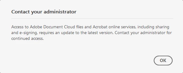 Access to Adobe Document Cloud files and Acrobat online services, including sharing and e-signing, requires an update to the latest version. Contact your administrator for continued access."
