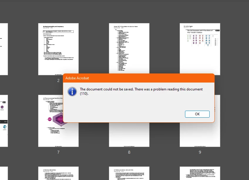 I am highlighting and adding notes to a PDF I'm working on, And I am getting "The document could not be saved. There was a problem reading this document (110)." error. I've tried un-ticking the security options in Preferences and still nothing. Is it because of the nature of the file? It being a medical textbook with navigation and bookmark features? Could I get around this and save my edits without losing those features?