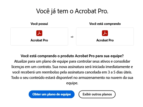 ZI'm having problems with Adobe Pro. I try to certify my document, and Adobe asks me to buy the plan again, however, when I try to make the purchase the response is: this purchase is not compatible. including confirming that the plan is active.