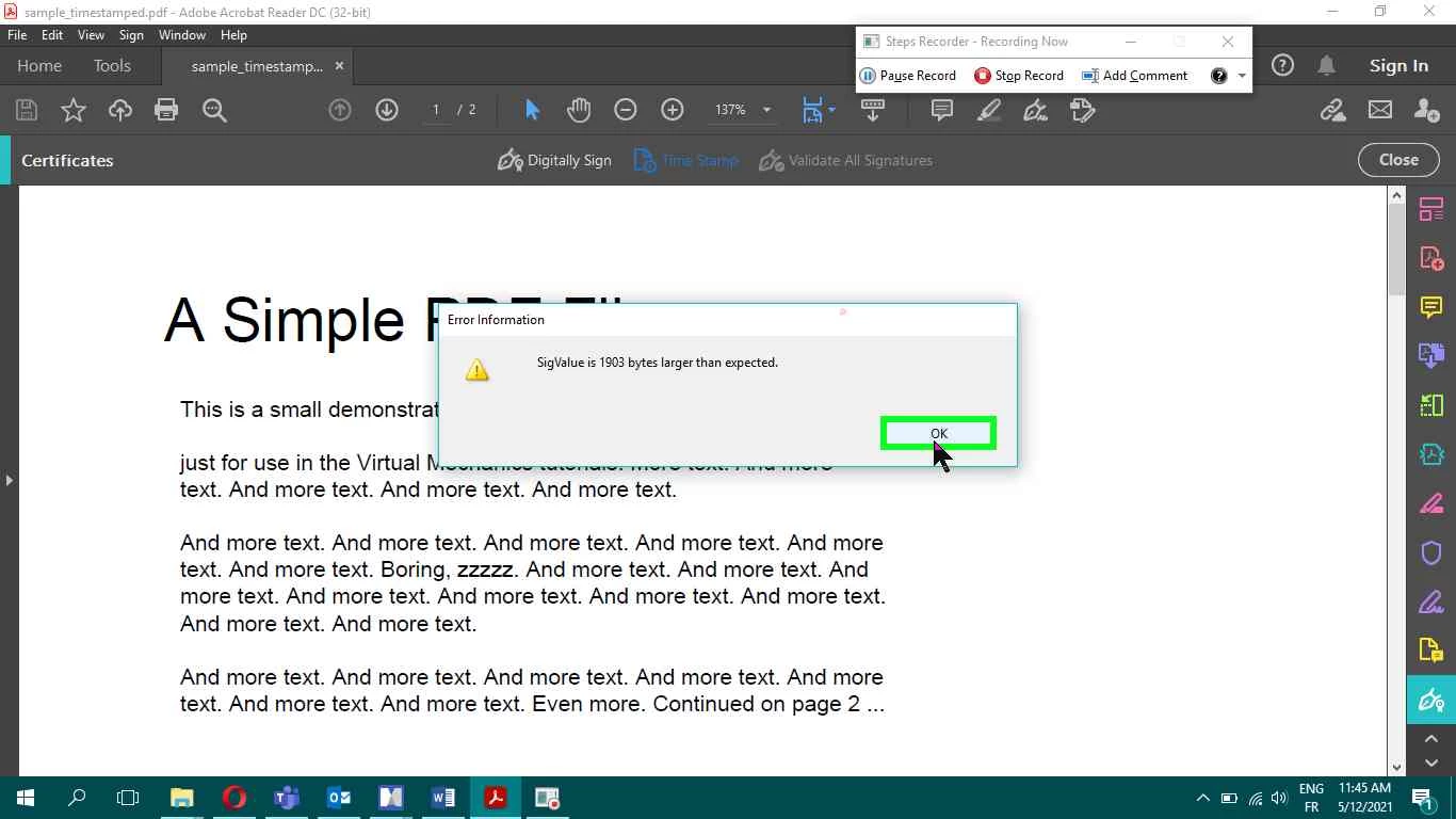 Using Acrobat Reader, I have been trying to apply timestamps on documents from a public timestamping server that I have configured. (a TSA that my company manages) Whenever I try to apply a timestamp the following error is returned: SigValue is 1903 bytes larger than expected.