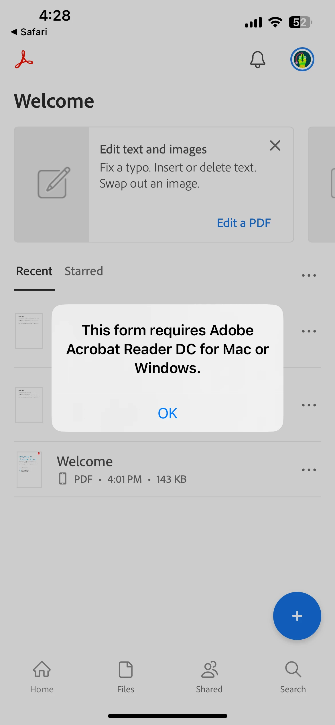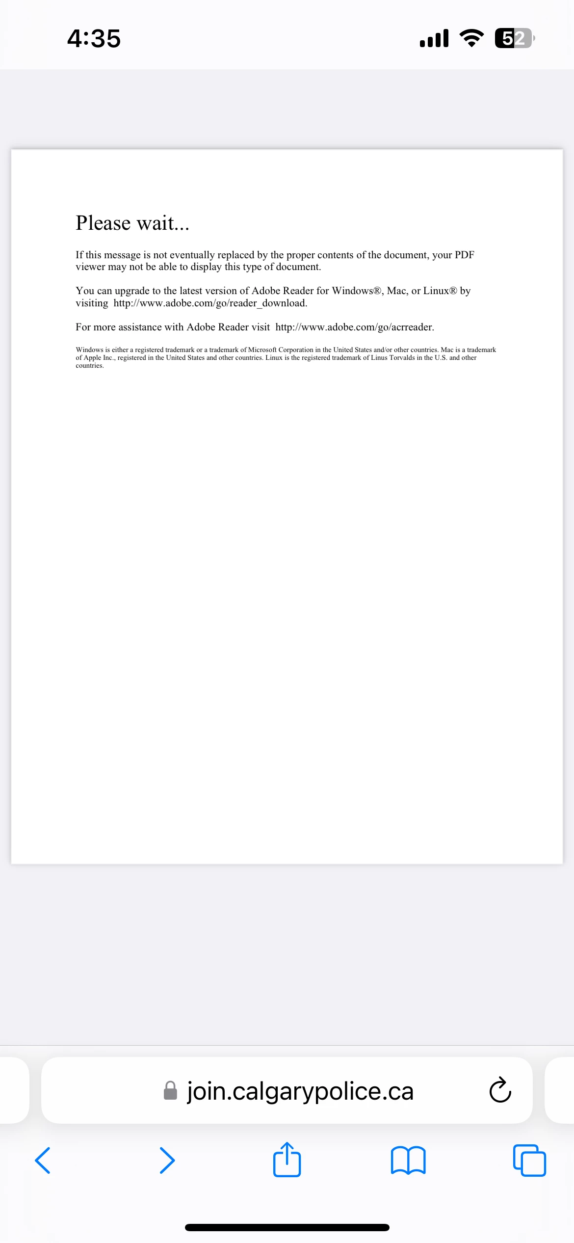 Downloaded the latest version of adobe acrobat today on our PC and my iPhone trying to open a simple PDF. We get the same message on both devices (see attachment). Any insight? Contacting the company who owns the PDF we are trying to open would be extremely difficult so we are hoping it's a Adobe issue.
