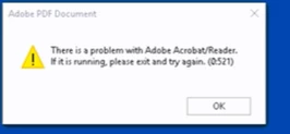 On one system we received a 0:521 error message with 'please launch Adobe acrobat...' and the other one was for us to launch Adobe reader first. We're using the product as a PDF viewer and have encountered these two errors out of 110 tests. Our software is calling for a PDF to be downloaded and viewed locally. I have not been able to replicate the issue and I'm not familiar with the logging, if any, involved. I see nothing noteworthy in the Windows Event logs.