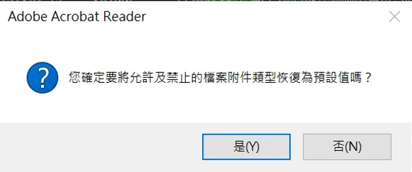 LLin wei tingParticipantForum|Forum|3 years agoMay 17, 2022QuestionUnable open pdfForum|Forum|3 years agoMay 17, 20221 reply371 viewsI setup Acrobat reader dc. Every time I try to open pdf file it shows: "Are you sure the allowed and forbidden file attachment types are reset to default?" All the pdf files have the same situation and can not be opened! thanksInstall update and subscribe to AcrobatStandards and accessibilityPDF forms