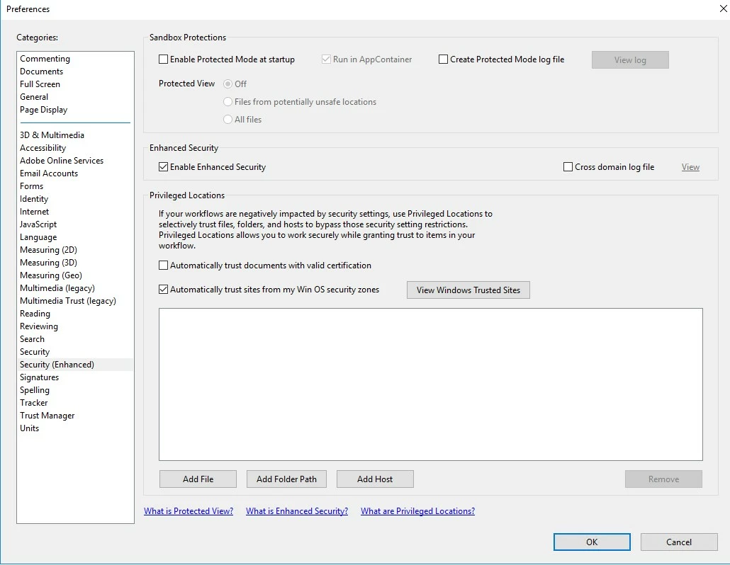 By unchecking the "Enable Protected Mode at Startup" box and closing and opening Adober Reader DC ..