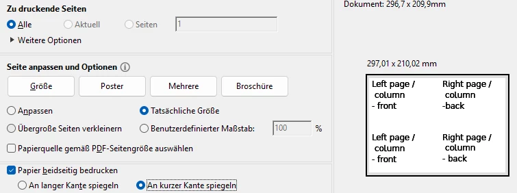 Example 2: Print a document containing 2 vertical pages (columns) on one horizontal page twice duplex, then cut the paper. So you get two sheets of paper contaning the left page/column at one side (front) and the right page/column at the other side (back).