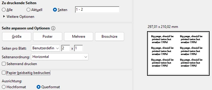 Example 1: Print two pages on one sheet of paper, then cut the paper an you get 2 smaller ones. (2 times A4 portrait printed as two times A5 portrait on one sheet of paper A4 landscape)*
