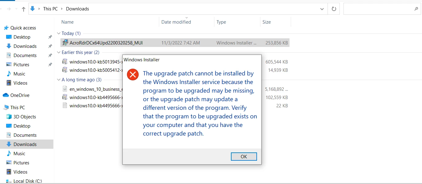We are unable to find base version to install the latest update Adobe Acrobat Reader DC 2022.001.20117 (MUI Installer) Continuous Track of 64 bit.