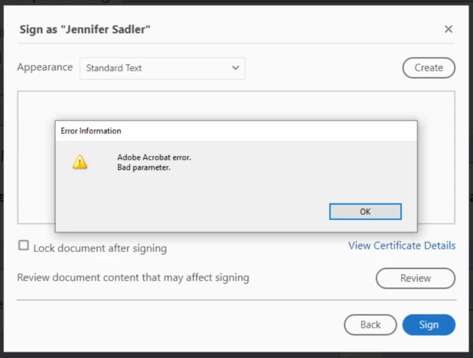 I have a document that requires a digital signature, as soon as the field is clicked a dialog opens that lets me select the signature I want to use. I've used this digital signature many times without error before.