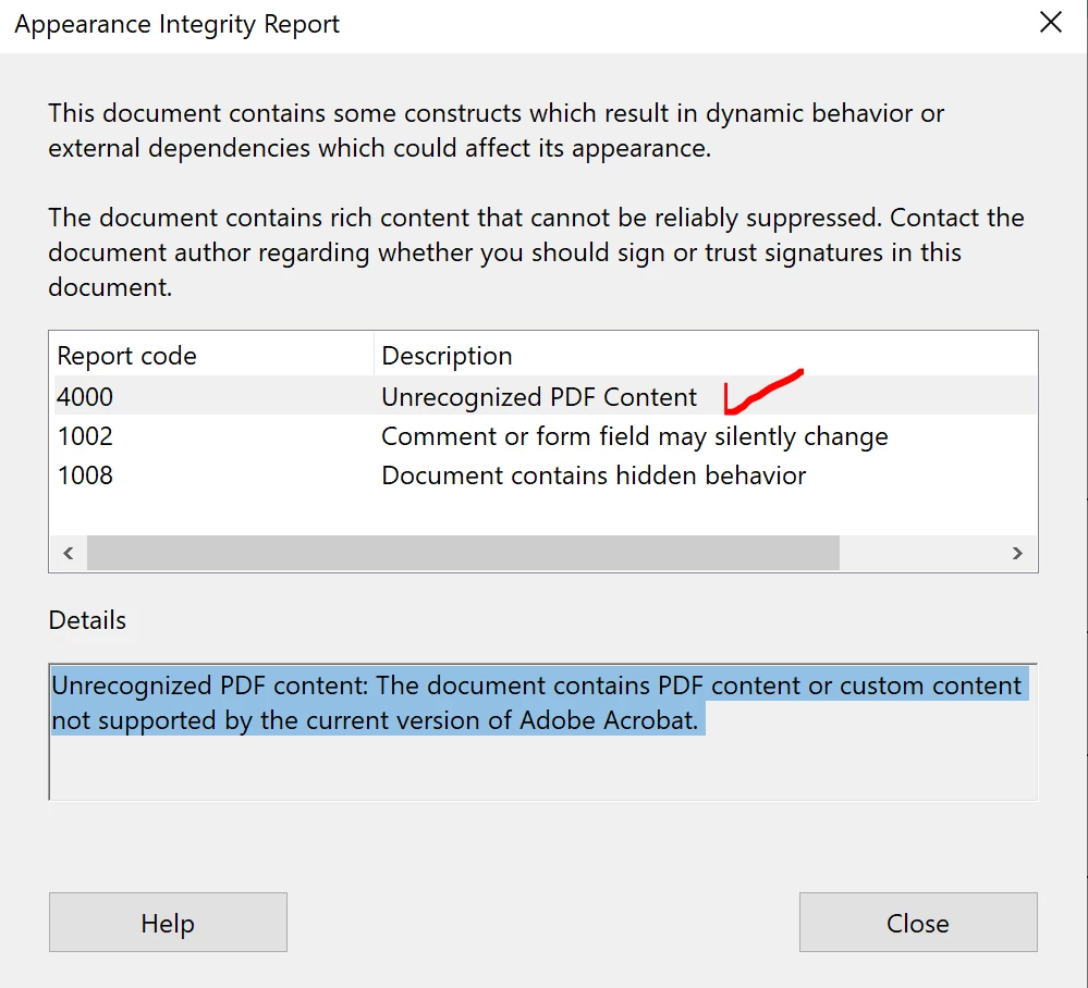 Unrecognized PDF content: The document contains PDF content or custom content not supported by the current version of Adobe Acrobat.