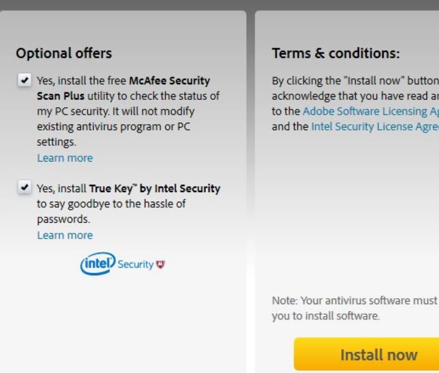 And as a result I get dumped with two very unwelcome Mcafee products. No checkbox to ask, no nothing. just part of the package.