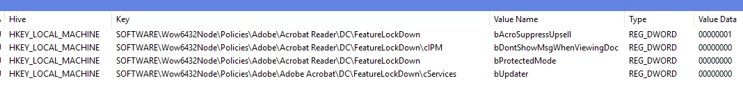 Registry path : - Computer\HKEY_LOCAL_MACHINE\SOFTWARE\Policies\Adobe\Adobe Acrobat\DC\FeatureLockDown