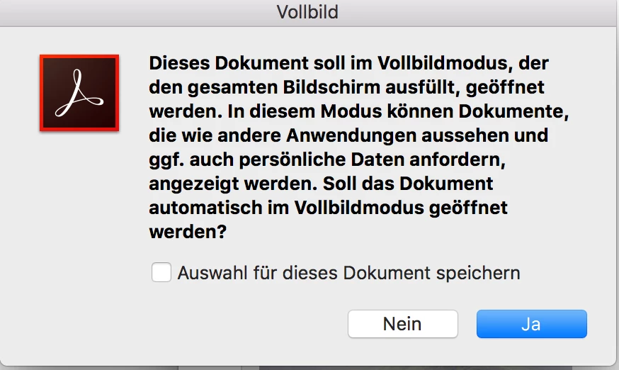 Ich versuche schon länger herauszufinden, wie man jedes PDF nicht mit Warnung Vollbildmodus öffnet.