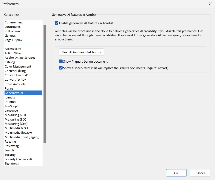 - Enable generative AI features in Acrobat (If you want to disable AI features entirely, simply uncheck this option)