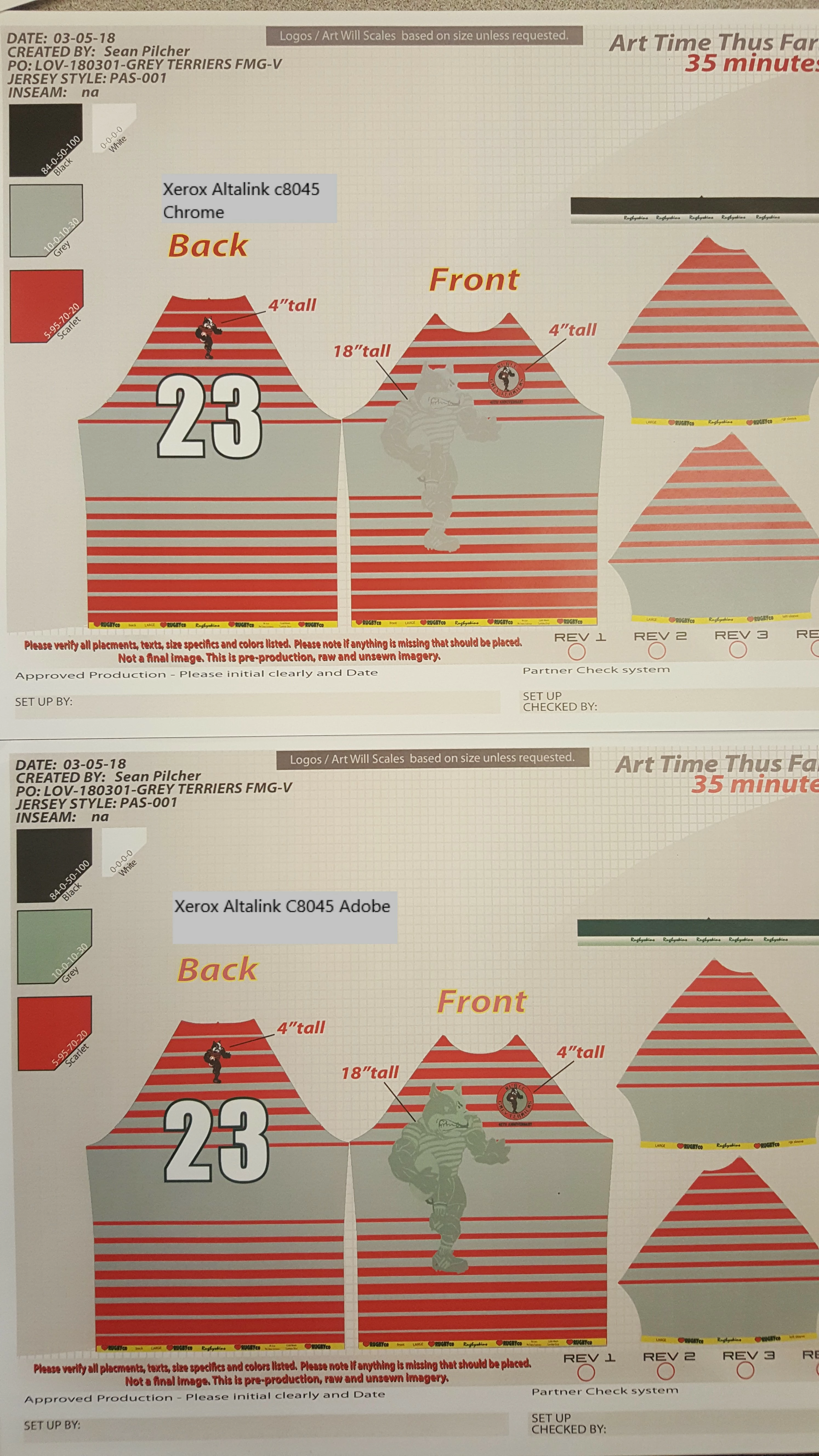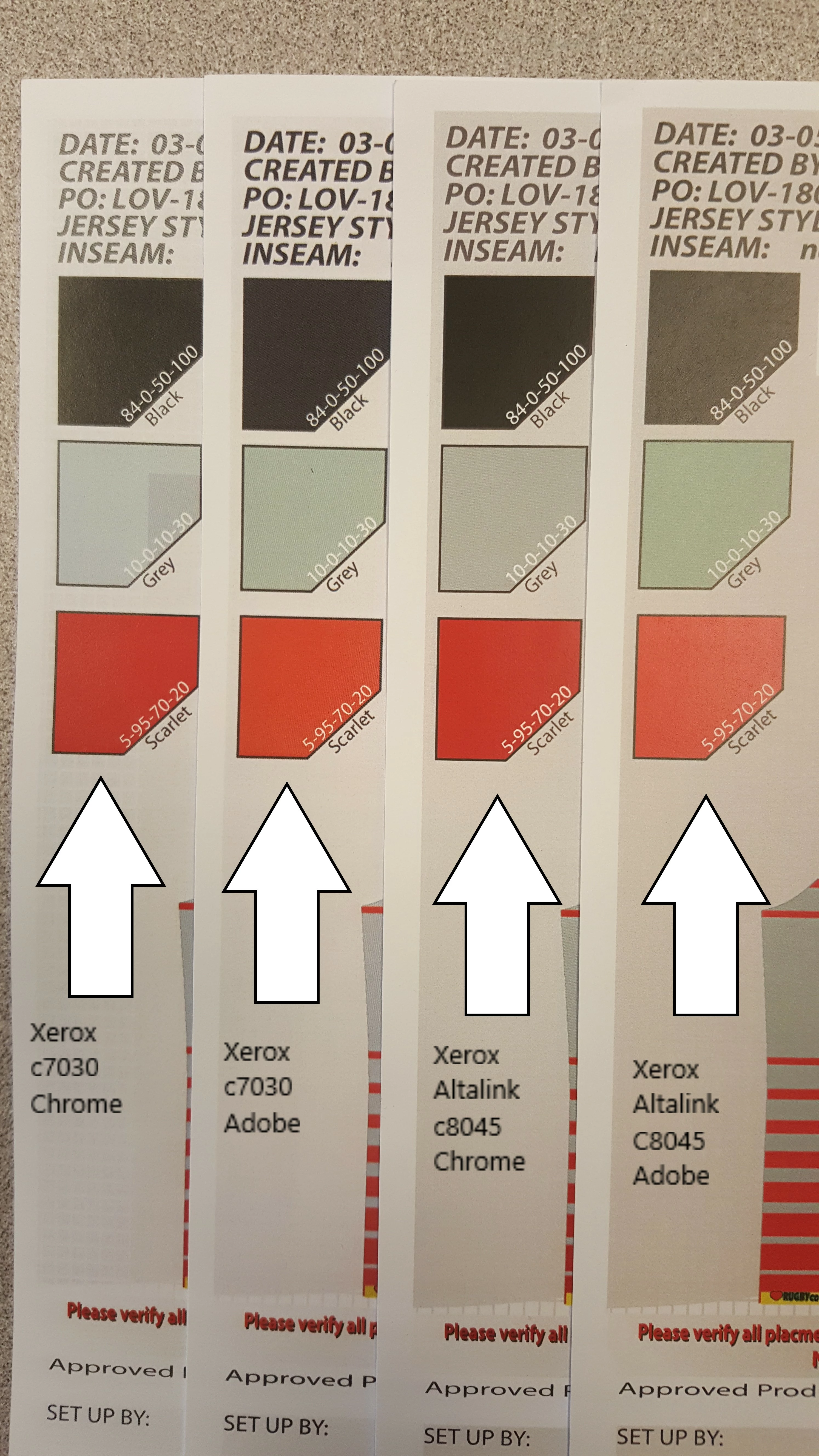 I need your help with something. We are having some issues with color when printing from adobe acrobat reader. We have a customer that does preprint with a Xerox c8030. I have attached some files 3 of them are pictures of prints from some of our Xerox’s that we have in house and they are labeled with what model Xerox and what program they printed from.