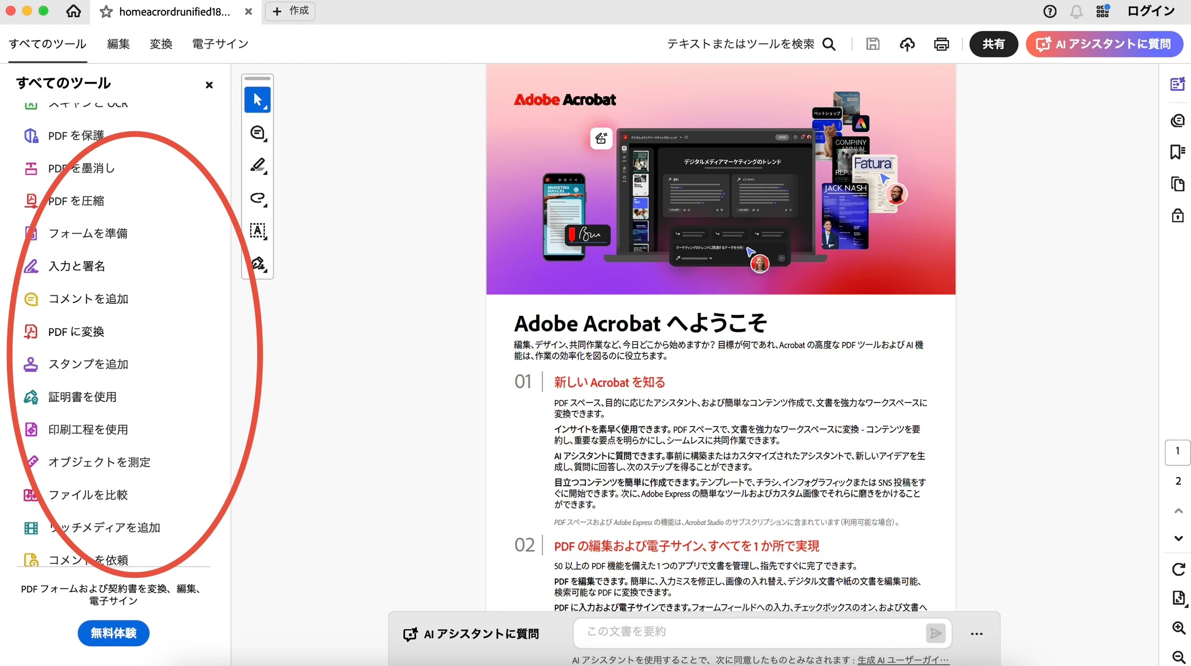 すべてのツールのメニューが表示されません。(acrobat reader)
