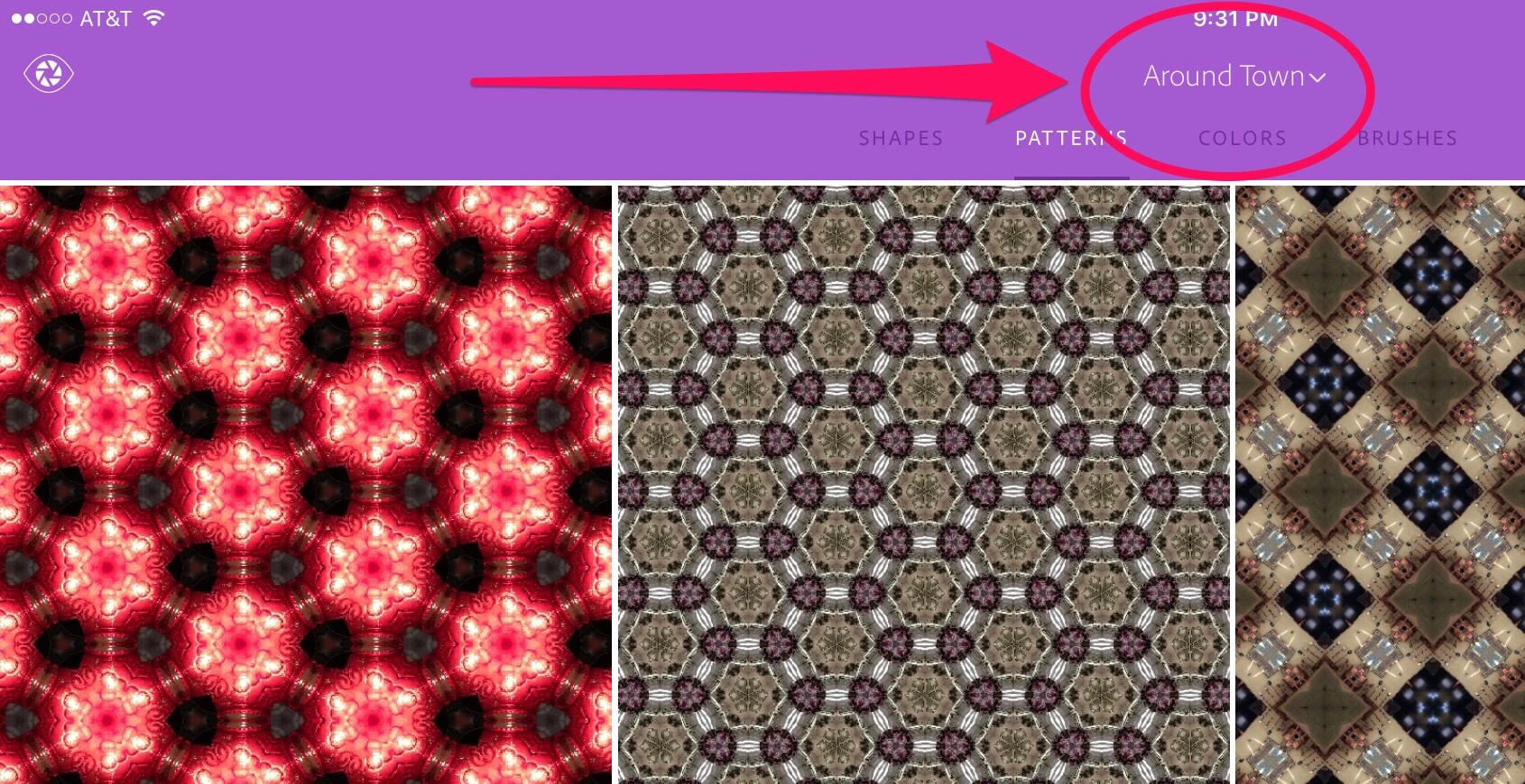 2. On the iPad, patterns are placed into one of potentially several libraries, specified with the drop-down picker at the top of the screen. In this example, I have my library called "Around Town" selected. Patterns I create will go into that library: