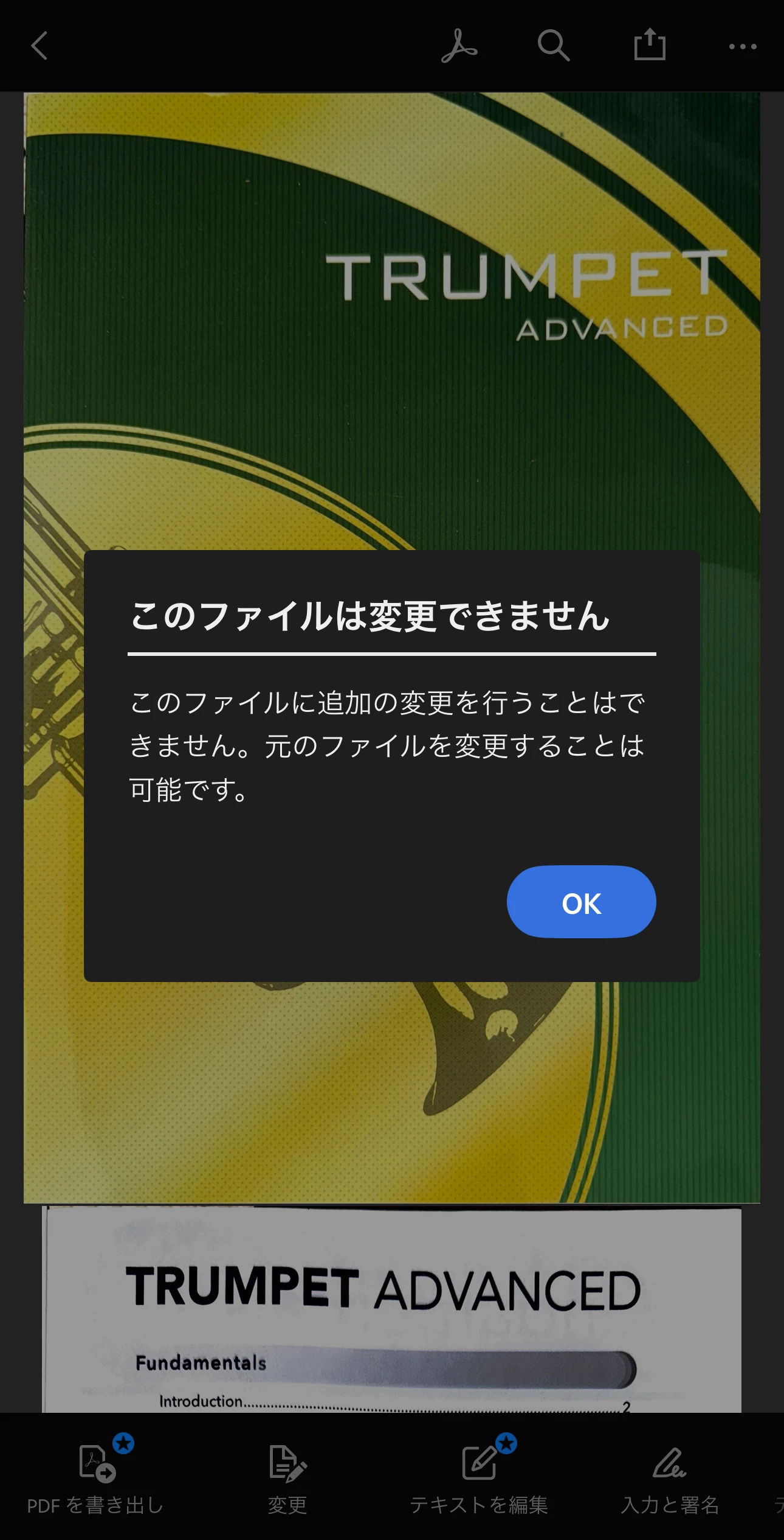 写真を撮りPDF化させたものを、その後ページ追加しようと思い【変更】ボタンを押したら画像のようなエラーがでてしまいます。対策をお願いします。