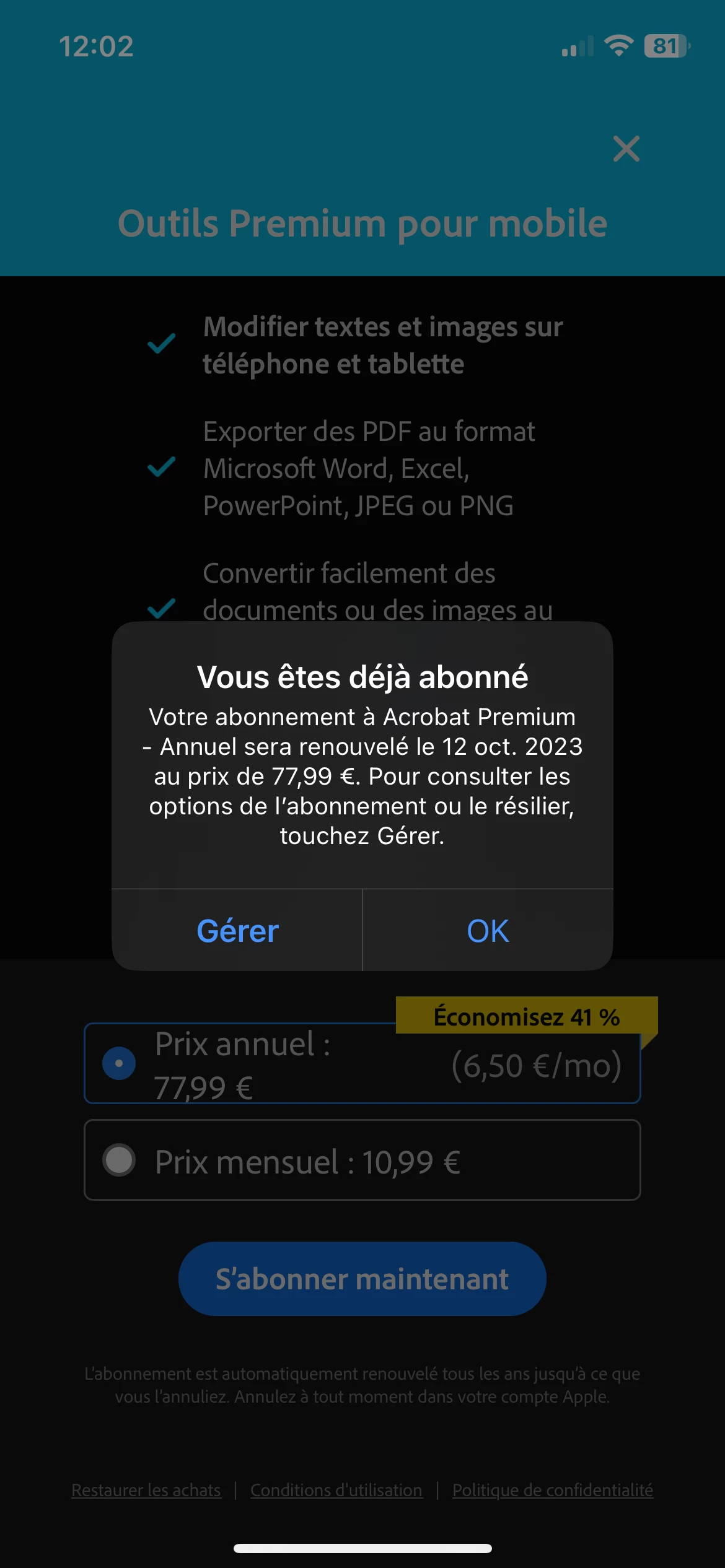 J'ai un abonnement Premium et je n'arrive pas à modifier le texte. Il me demande de gérer l'abonnement. Cependant lorsque je vérifie l'abonnement c'est dit que j'ai la modification de texte. Comment résoudre le problème c'est urgent ‼️