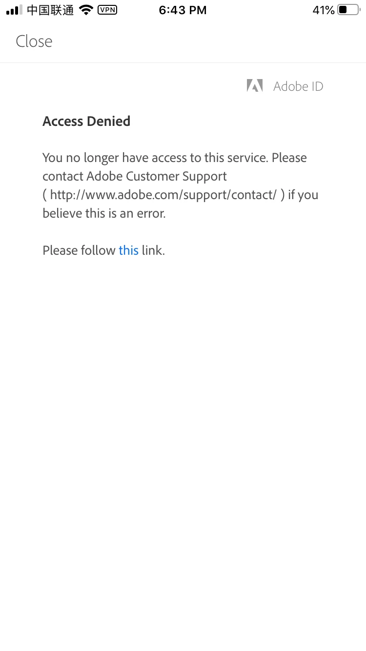 When I use my Adobe ID login Adobe Acrobat Reader for PDF which I download from App store in my iPhone, I failed and alert me: Access Denied, You no longer have access to this service. Please contact Adobe Customer Support…But I can login other apps such as PS Express, Lightroom, Adobe Draw with the same ID, Help.