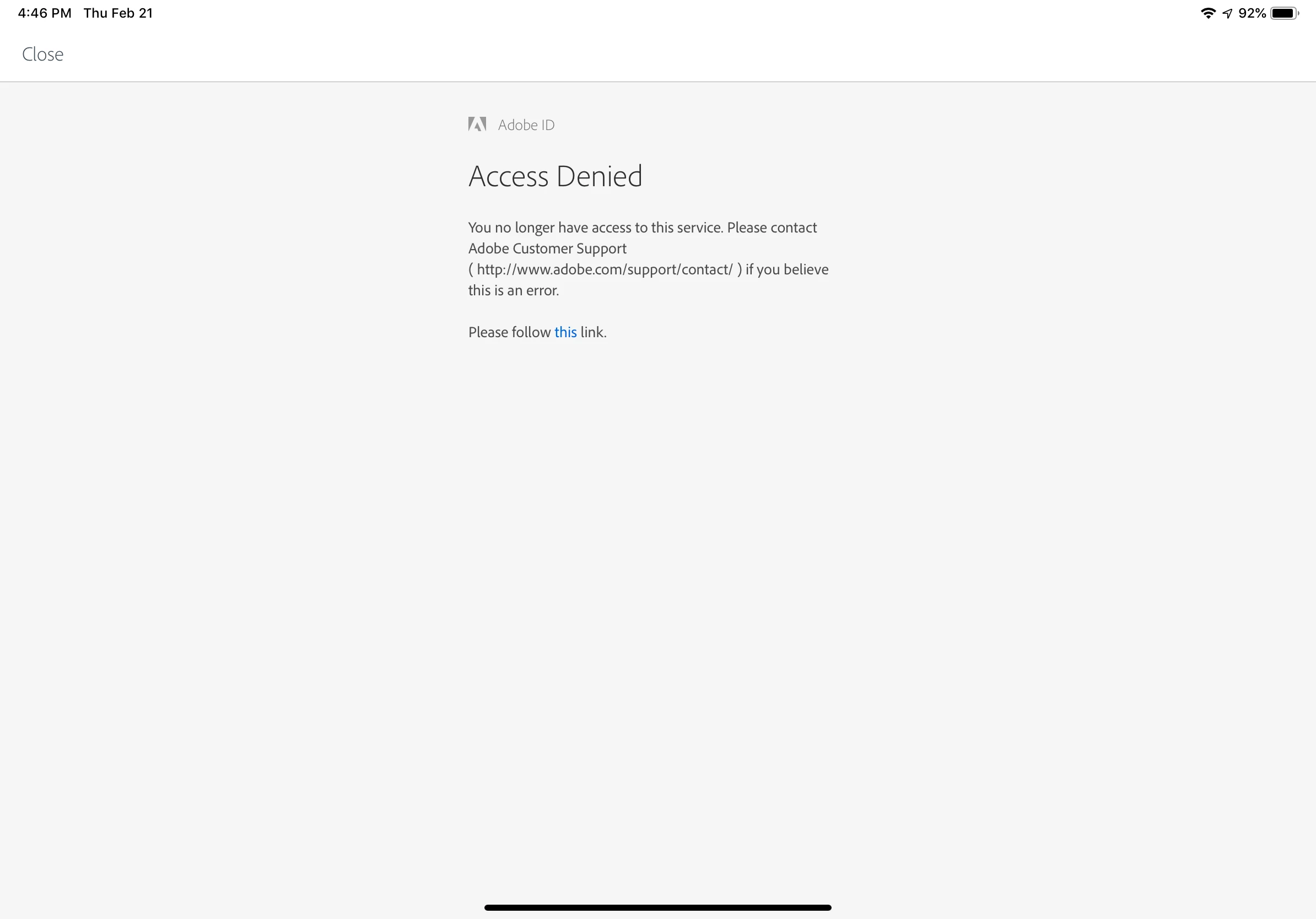 You no longer have access to this service. Please contact Adobe Customer Support if you believe this is an error.