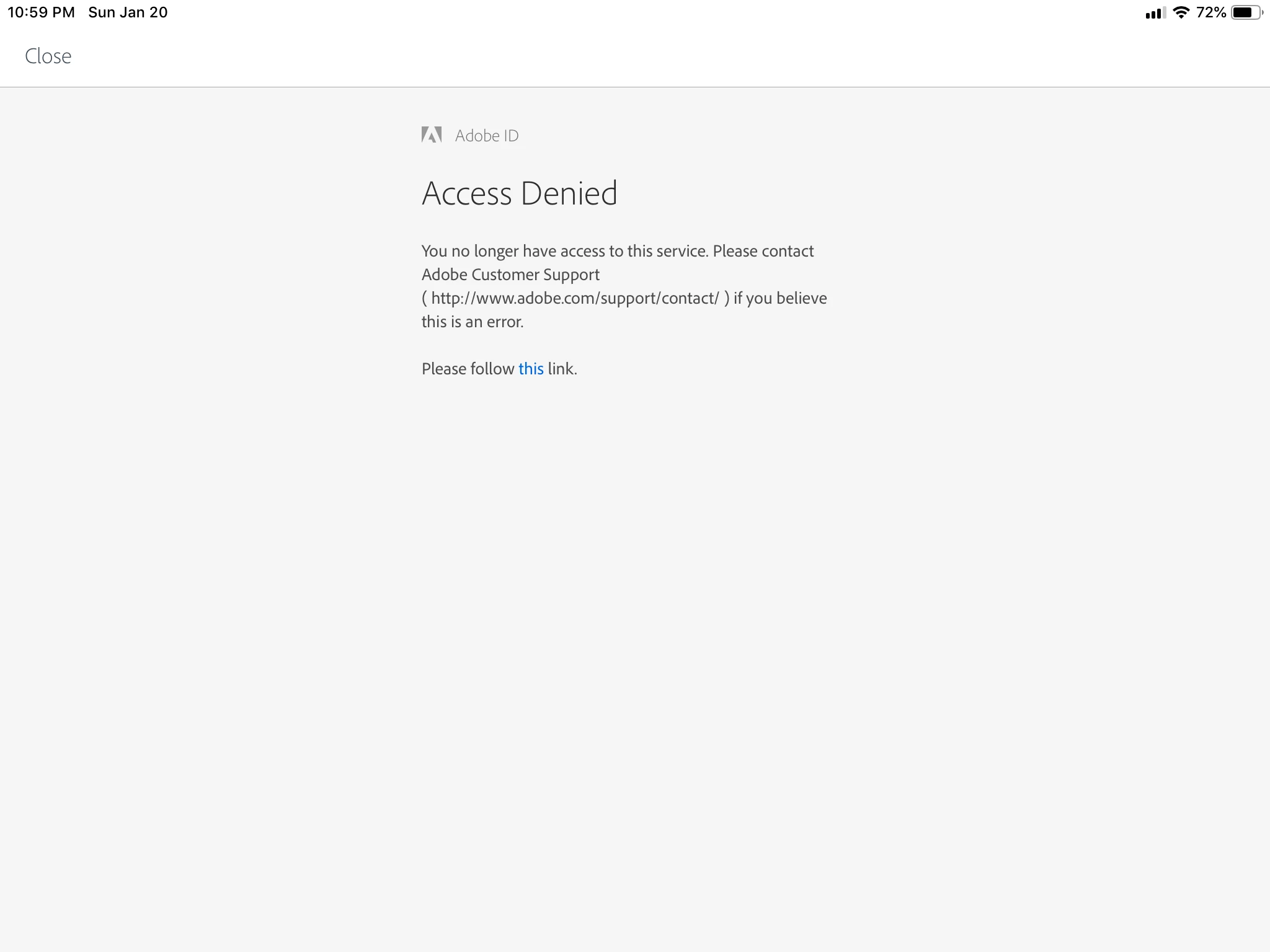 BUT, I seem to never be able to sign in Acrobat Reader for iPad and I keep receiving an error message upon login attempt that says “Access Denied”. I’m trying to attach a screenshot of this.