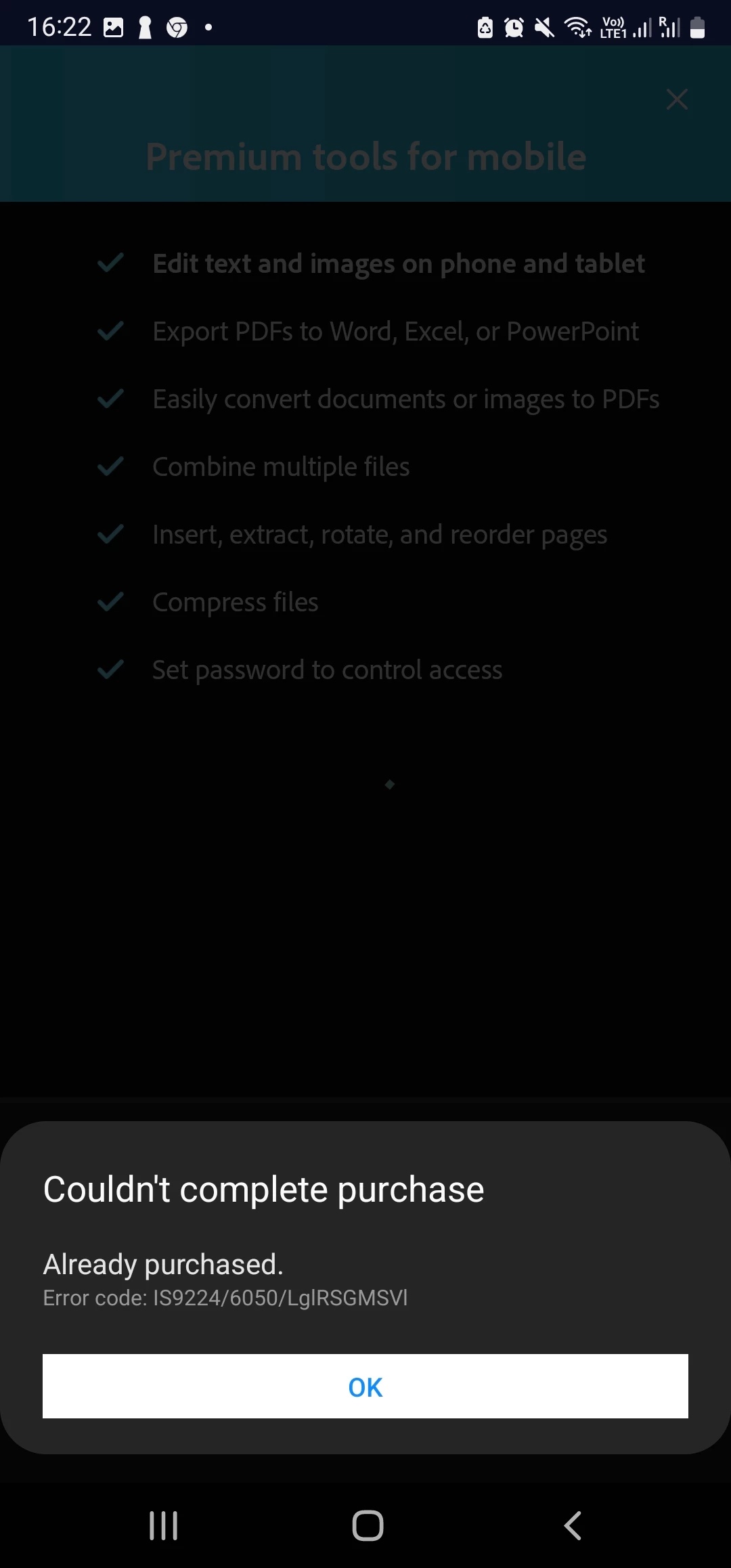 I am really unsatisfied with what has happened. A week ago I needed to use acrobat on my phone as I was away and had to sign some documents and this was pretty much the only time I used it. I found out that I had to start a subscription to be able to edit the doc but while trying to do it I got an error and thought okay maybe there was an issue with my connection and when I tried to do it again(this is to start the 7 days trial) it was giving my an error saying that I already had purchased this. Now fast forward a week from that time I get a receipt where £53.89 VAT included are gone from my account while acrobat still shows that I don't have a subscription so there was no way for me to cancel and still not and just losing money. Great, now can I please somehow cancel this and please get my money back? I never ended up using the premium feauture anyway as I still have no acess to it, just somehow getting my monety though.