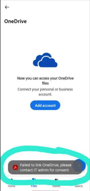 I have Adobe Acrobat Reader on my Android cellphone (with the newest Andriod version) and on my iPad. I can easily connect to my OneDrive Account on the iPad app, but I keep on getting these messages when trying to connect the Andriod App to my OneDrive. I have tried on more than one Andriod device, but the problem is the same (both Samsung phones). I have also contacted out IT department.