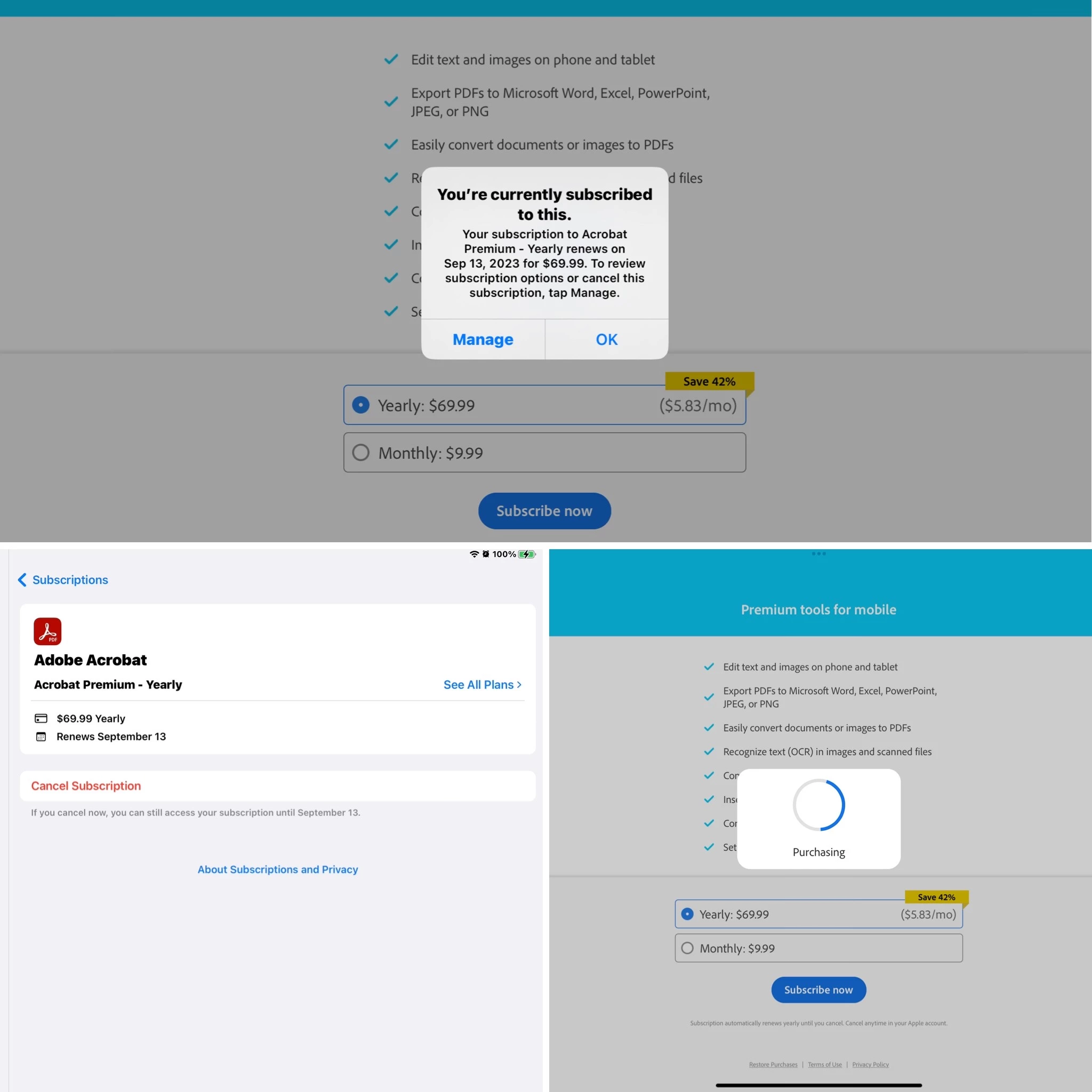 I purchased the Adobe Premium annual plan, via the app on my IPad, in September and cannot open it. I continue to be asked if I want to purchase but when I do, it says that it has already been purchased. When I press ok, my screen locks up with a spinning circle. I have tried to restore purchases, sign out, delete and reload app to no avail. PLEASE HELP!
