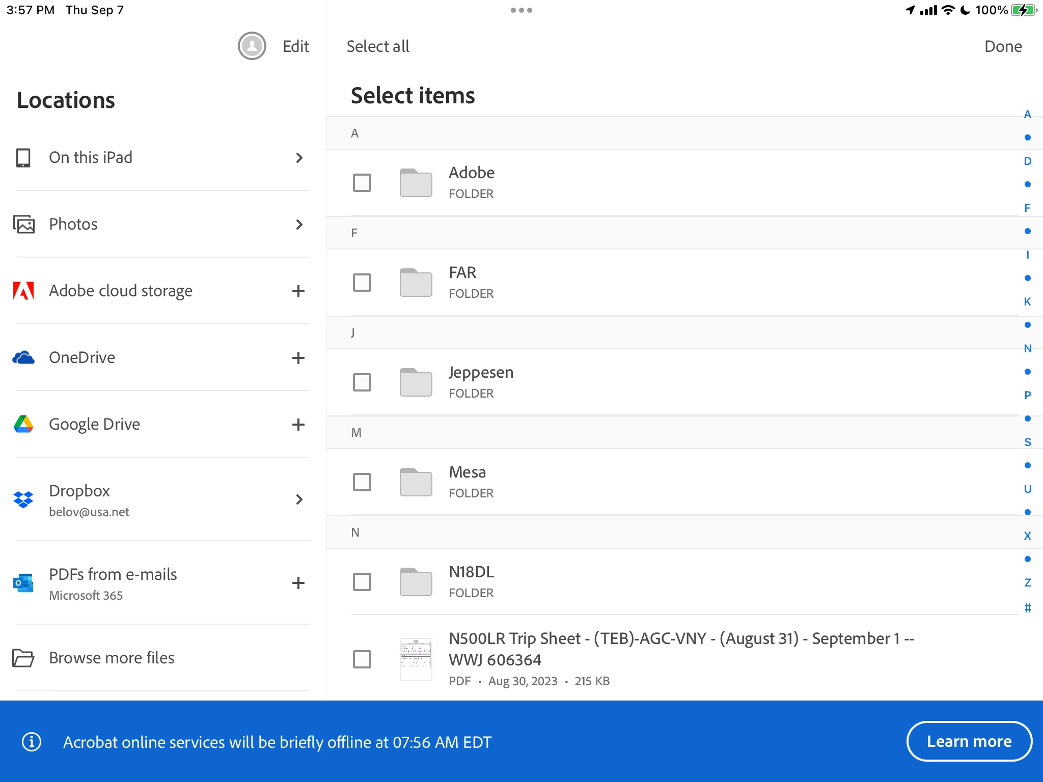 Adobe Reader for iOS "online services offline" message blocks selected files controls