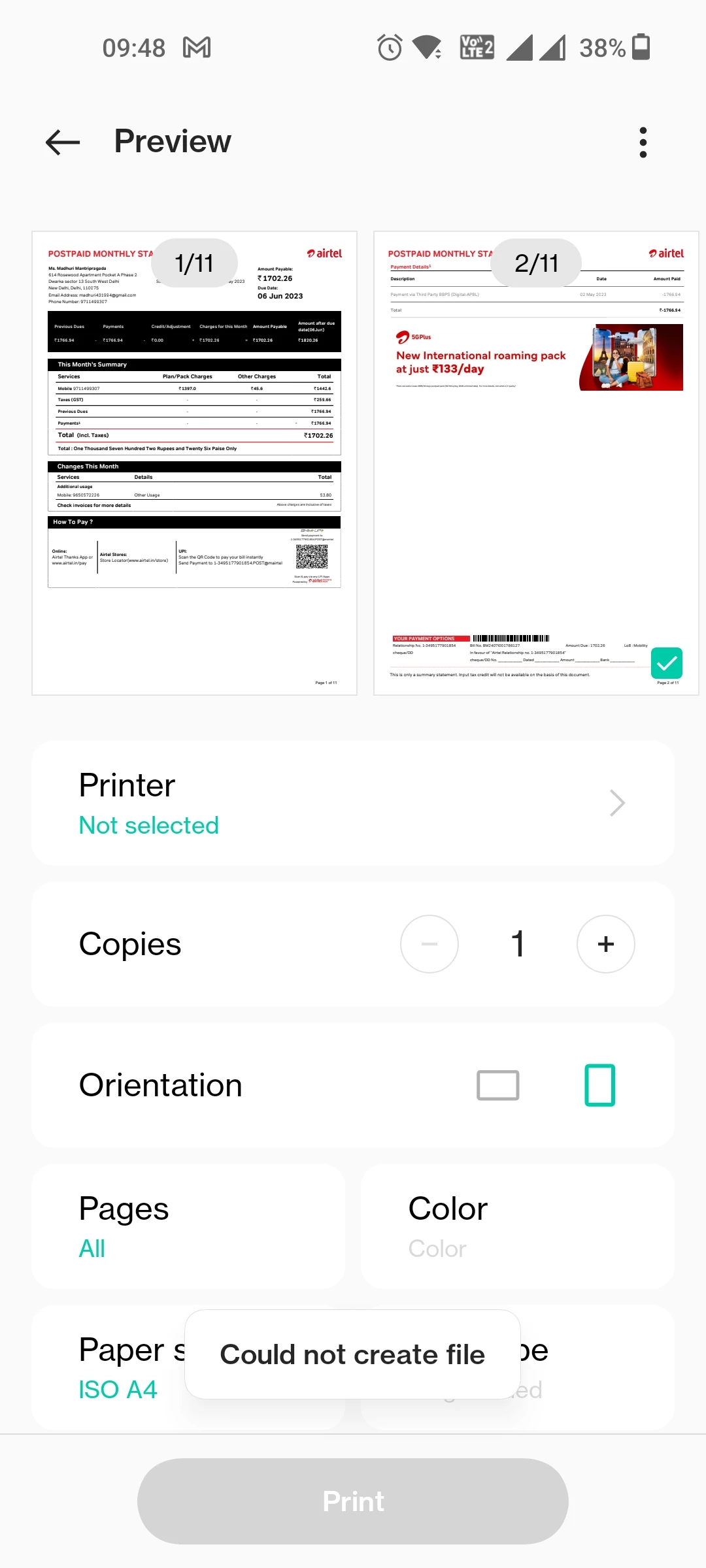 Trying to save few selected pages as pdf in Adobe reader mobile (android) preview but running into "could not create file" error (attached)... Is this only a premium feature Or a bug?
