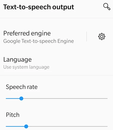 - Configure the setting as need. For example, you may be able to select a preferred text-to-speech engine, the language, speech rate, and pitch.