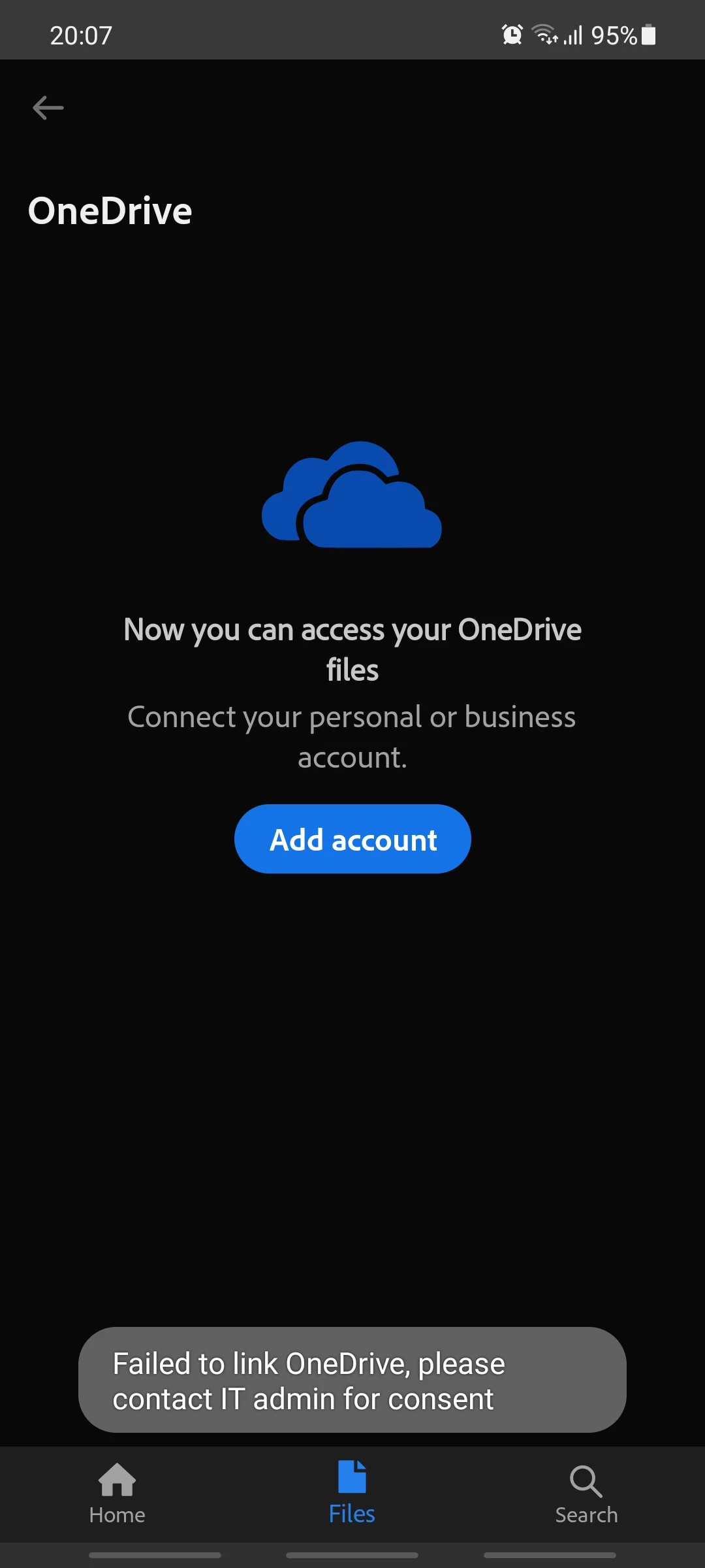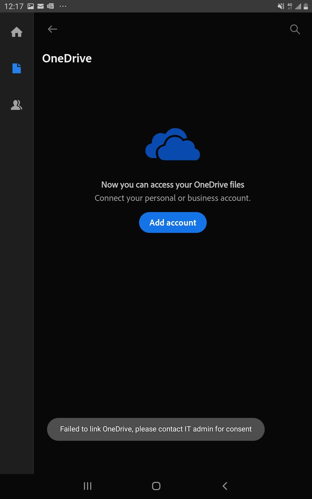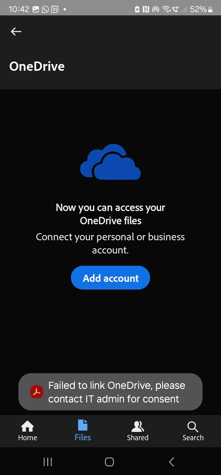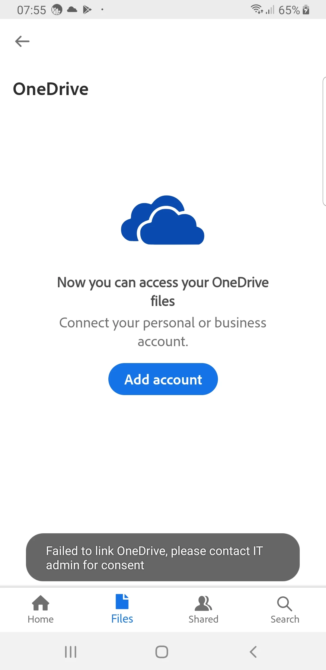 I want to link my OneDrive to Adobe Acrobat on Android but it gives this message: Failed to link OneDrive, please contact IT admin for consent.