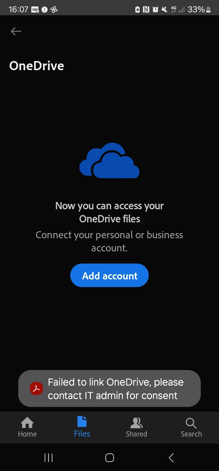 Cannot connect onedrive to adobe reader on android device
