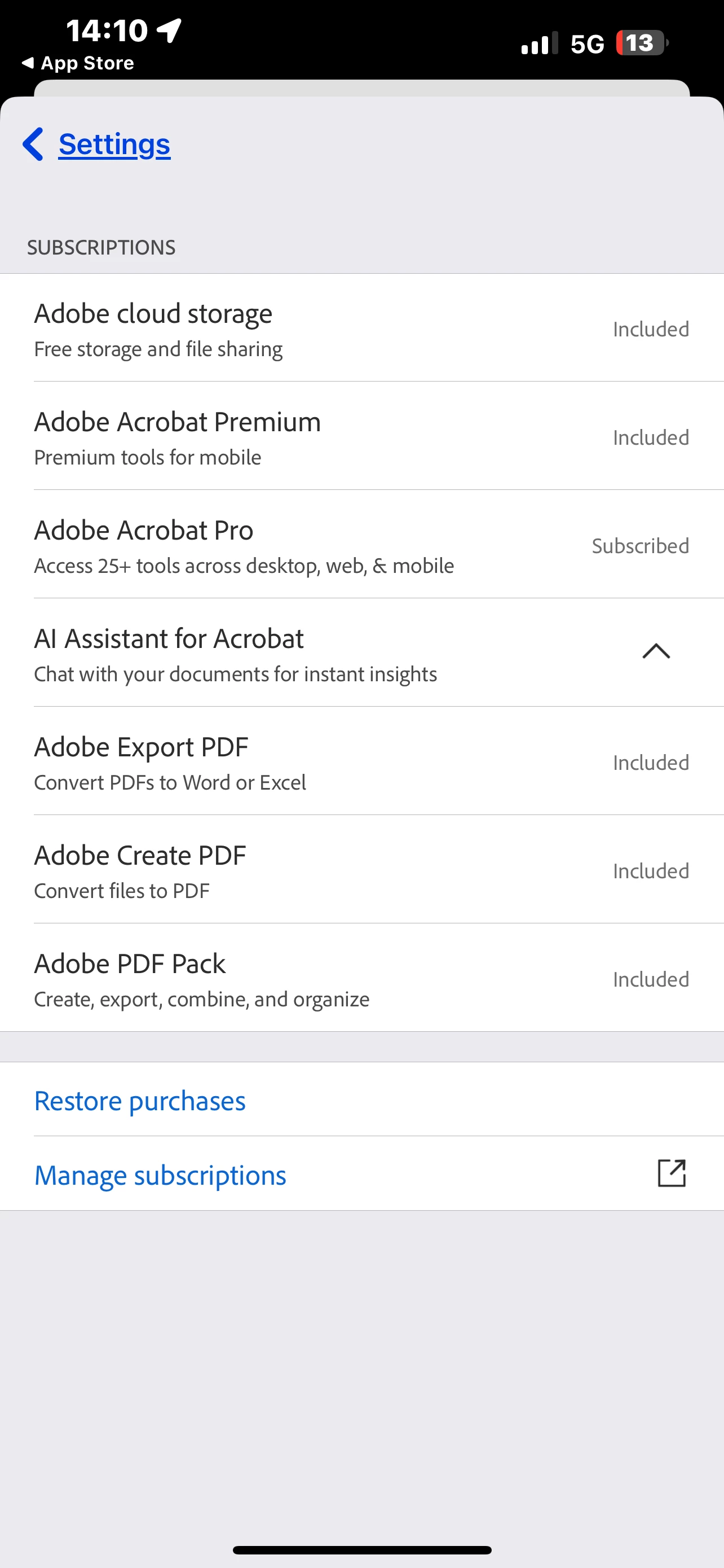 Hi wonder if there is a bug? I tried using adobe acrobat on iphone and ipad i have the latest updates for both i even uninstalled and reinstalled adobe acrobat but i am unable to choose more tham 1 photo whne creating a pdf . As is is only possible to select only 1 photo , i created a pdf with that photo , than selected edit and add more photos , but even then i couldn.t choose any , the button to add more photos is frozen . Would appreciate ur help tkx! Here is what is showing under subscription inside adobe pdf