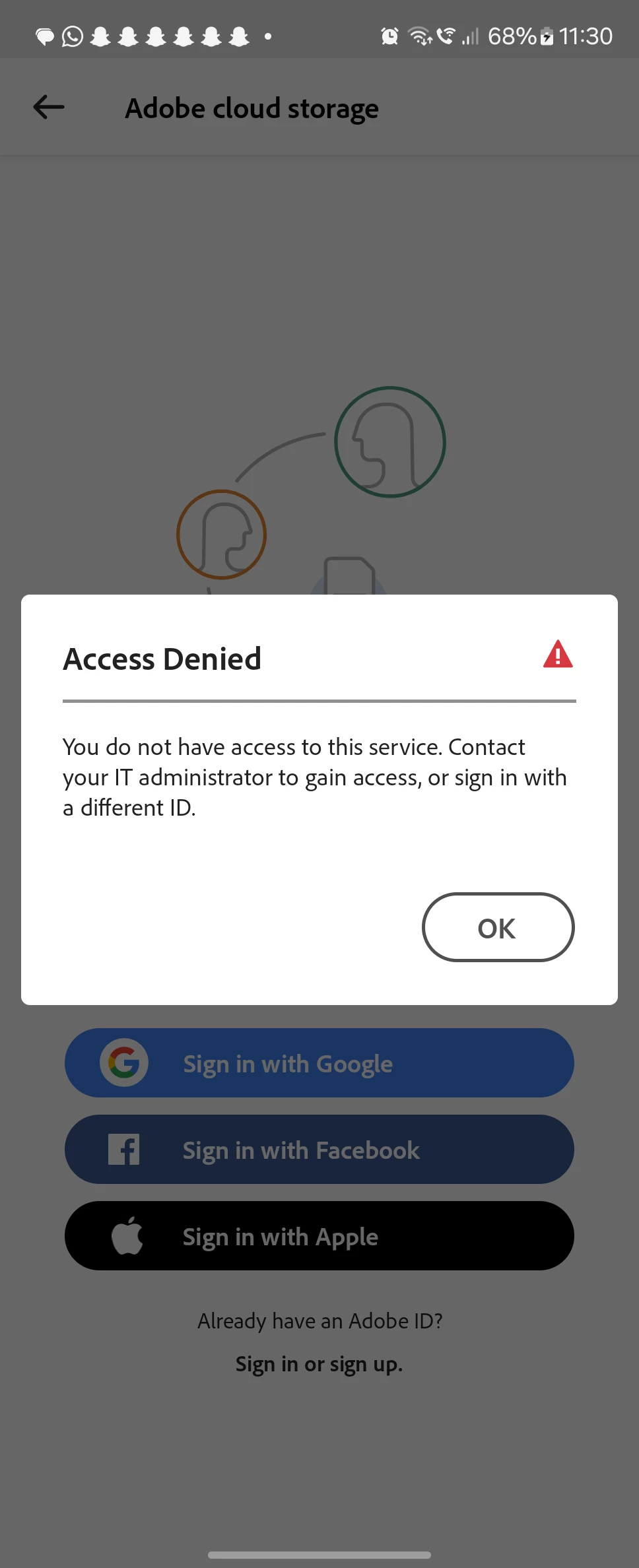 Does anyone know why I cannot sign in to my adobe account? Everytime I tried, it says I don't have access to the service and to contact IT administrator (please see screenshot). Initially I tried signing in to the android adobe reader app and it failed, but then I tried it on the computer and that also failed. So I'm thinking something is wrong with the account itself.