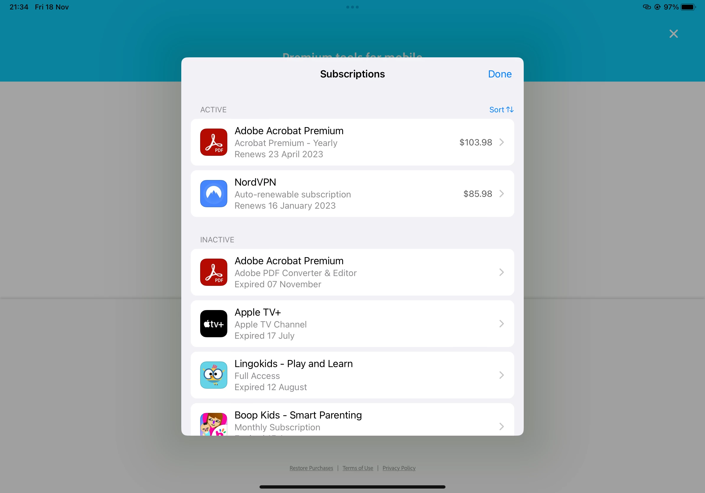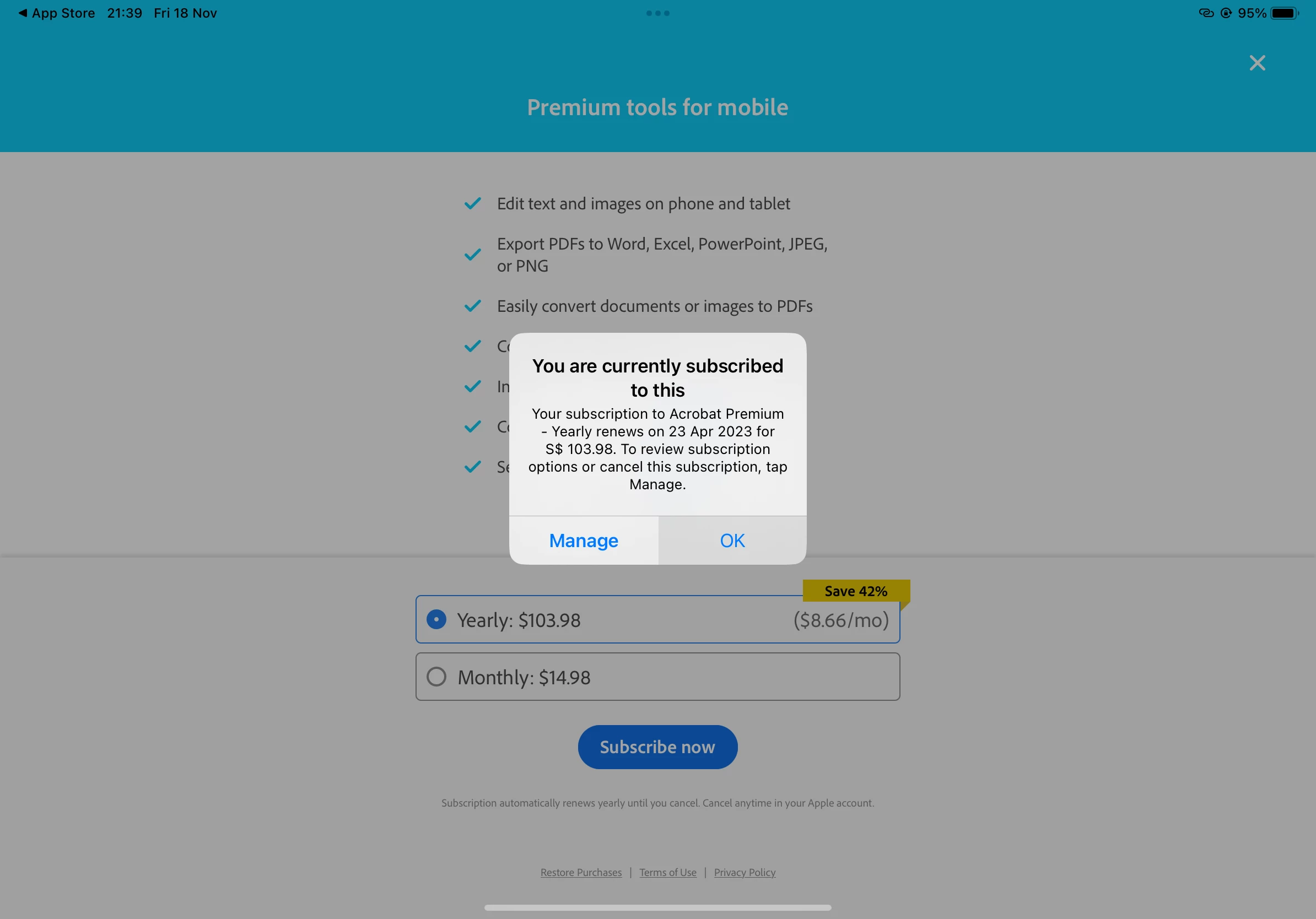 I AM SUBSCRIBED UNTIL APRIL 23, 2023. BUT IT SHOWS I AM A FREE USER. I DOD NOT HAVE ANY PROBLEMS UNTIL APP WAS UPDATED AND IT WNATS ME TO PAY AND SUBSCRIBE TO ANOTHER APP ADOBE PDF CONVERTER AND EDITOR. TRIED TO RESTORE PURCHASES ON THE APP, RE INSTALL APP, UPDATE APP, UPDATE IOS, BUT STILL CANNOT USE. YOU SHOULD REIMBURSE MY SUBSCRIPTION FOR THE PAST MONTH AND SUCCEEDING MONTHS IF YOU CANNOT FIX THIS.