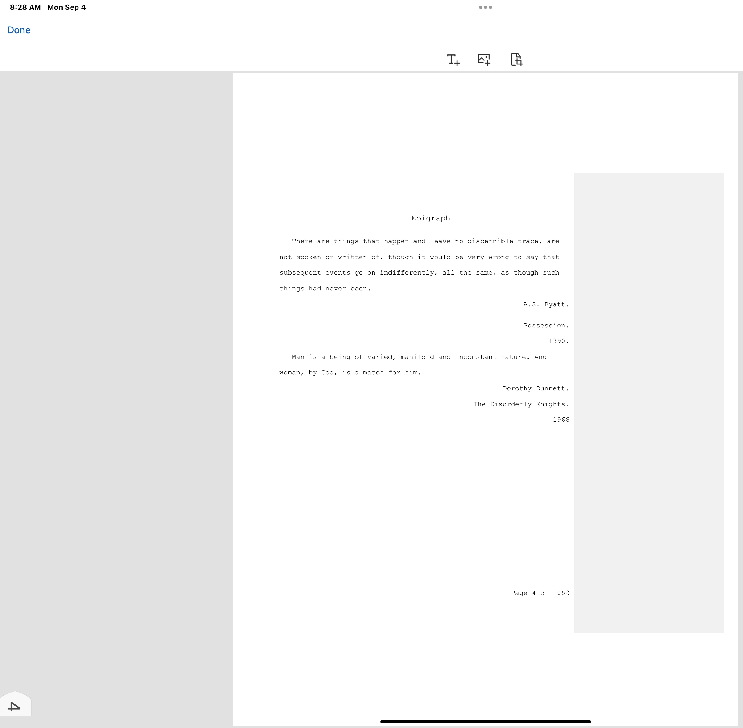 If you look at the attached images you'll see that the text margin is right on the left but is pushed almost to the edge on the right. And there's that big gray box. I've searched extensively and found no way to scale pages on the ipad app. I find it very difficult to work on a manuscript that is so lopsided.